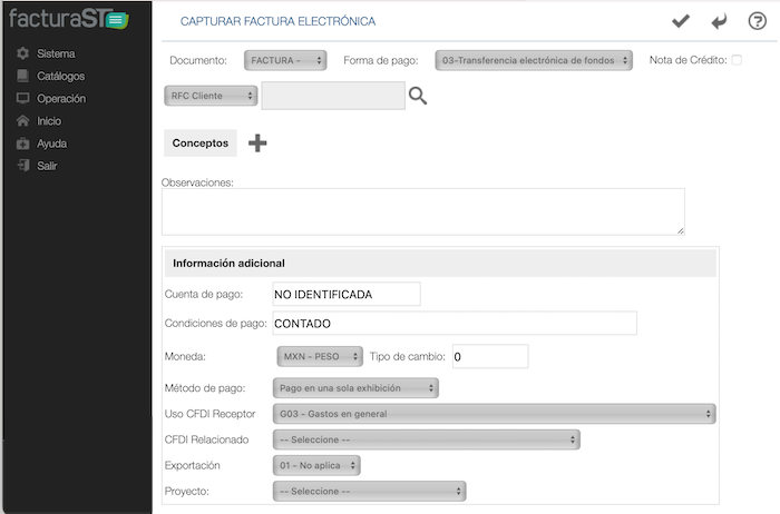 Sistema basado en catálogos para su fácil uso, registra solo una vez a tu cliente, concepto y datos comunes, para después facturar solo con un par de clicks.